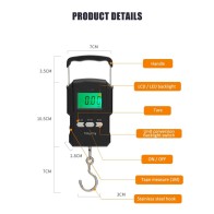 Il s'agit d'une balance numérique suspendue d'une capacité maximale de 75 kg et d'une précision de 10 g. Elle est dotée d'un écran LCD vert rétroéclairé affichant le poids. De couleur noire, elle est dotée d'une poignée pour un transport facile. Sous l'écran, la capacité est indiquée (« 75 kg/10 g »). Un crochet métallique est fixé à la base pour peser des objets tels que des bagages, du poisson ou d'autres objets. Le nom du produit suggère qu'il est également livré avec un mètre ruban de 100 cm. Elle est conçue pour diverses utilisations, notamment la pêche, les voyages et le pesage de bagages.