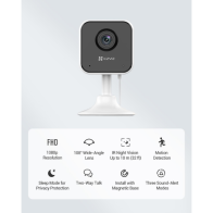 La EZVIZ H1c est une caméra Wi-Fi d'intérieur Full HD 1080p alliant simplicité et performance. Elle offre une vision nocturne nette jusqu'à 10m, une détection de mouvement avec trois modes d'alerte sonore et un audio bidirectionnel. Son socle magnétique et son kit de fixation inclus permettent une installation instantanée sur toute surface pour une surveillance discrète.
